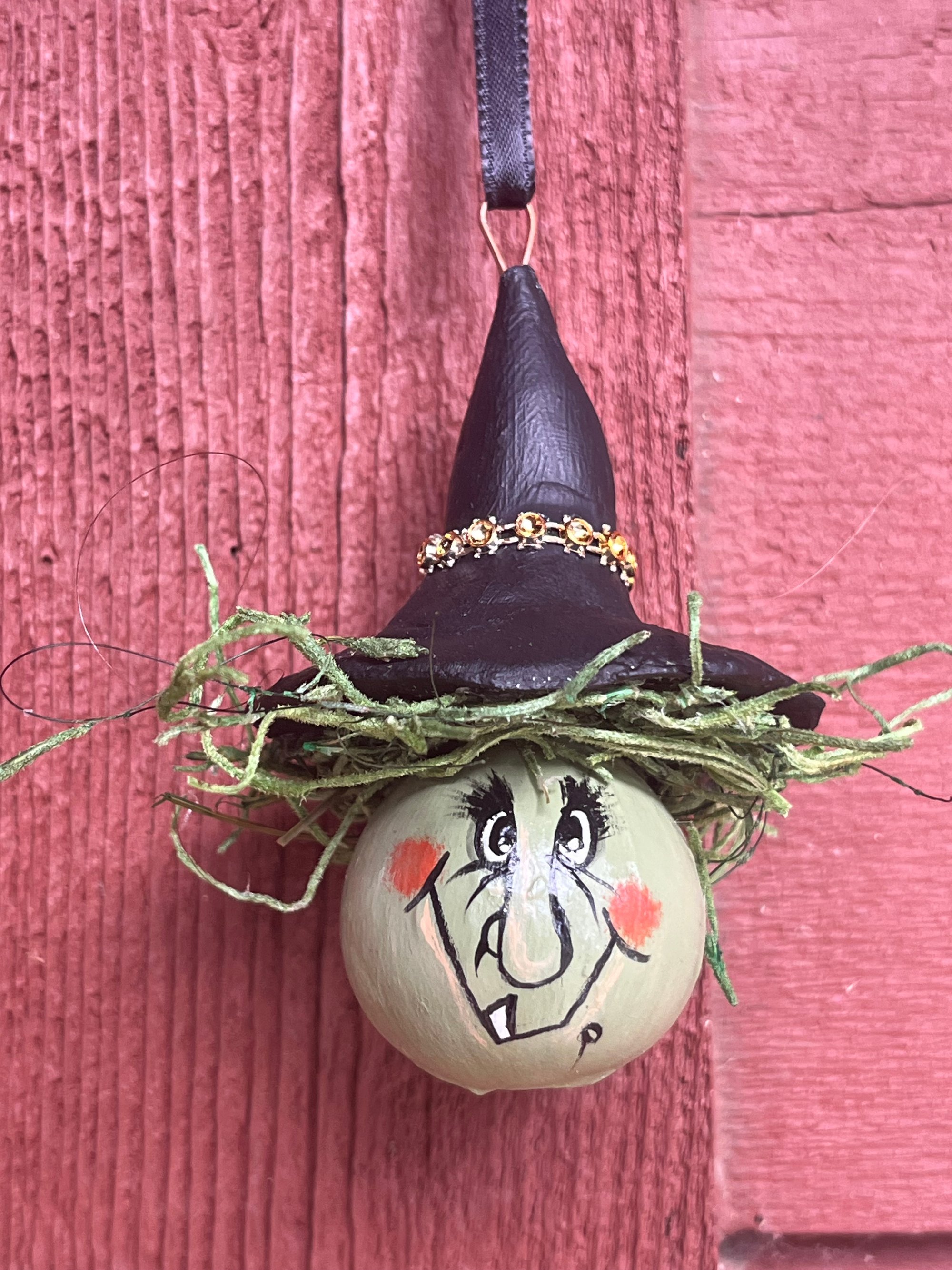 Hand-painted mini gourd, hand-sculpted and painted foam hat, dyed Spanish moss hair. Sealed but indoor use only, please. Witches are approx. 3.5 inches long.